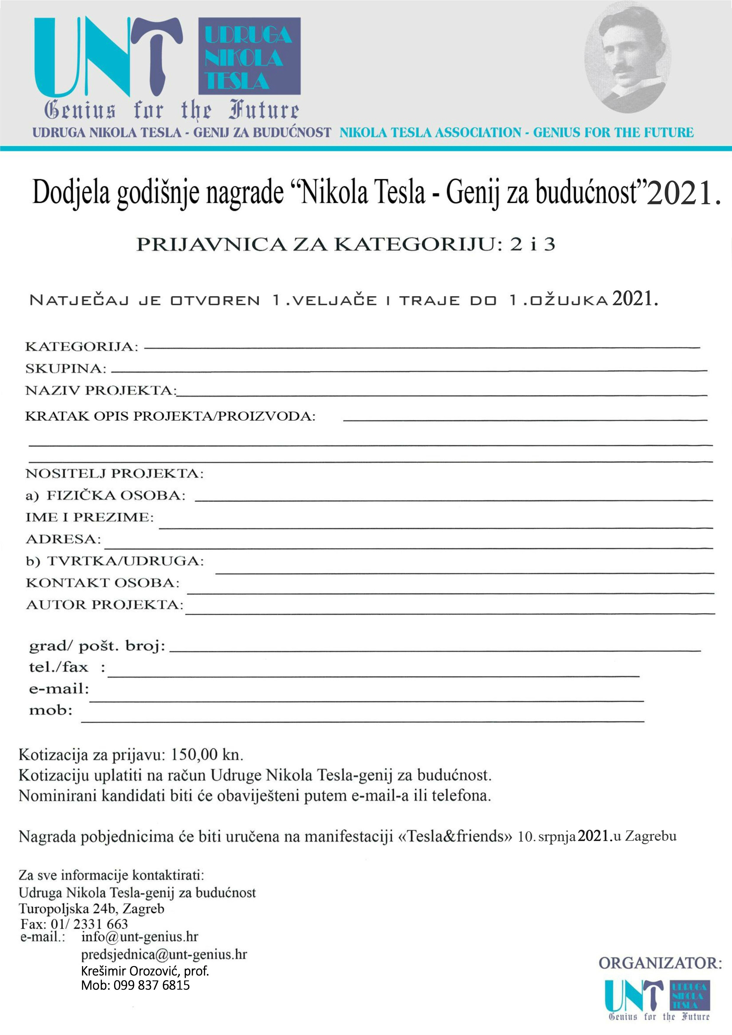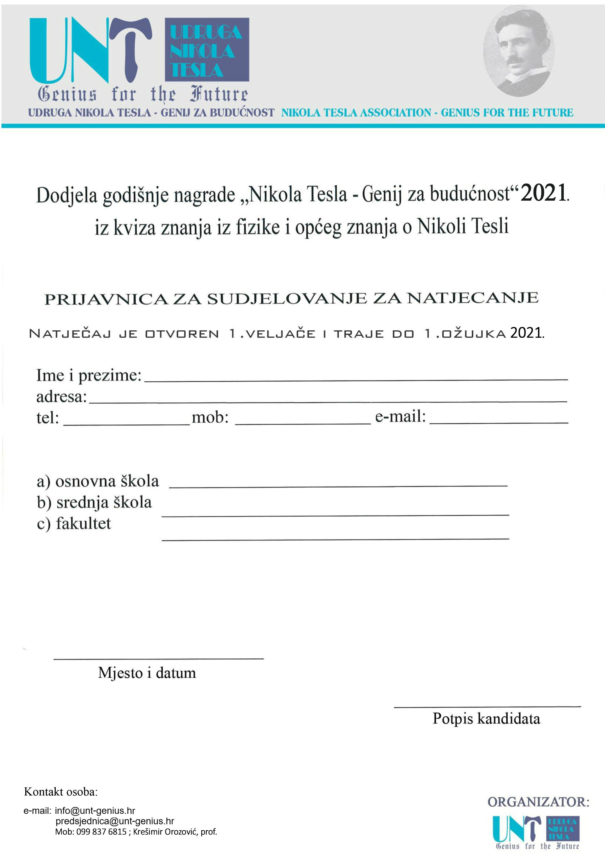 Prijavnice za natječaj - Udruga Nikola Tesla | Genij za budućnost